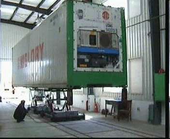 直流升降、行走,兩臺升降臺合頂一只冷藏集裝箱,合用一個行走動力,兩臺升降機可聯動升降,亦可單獨升降